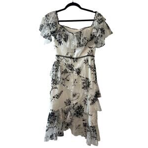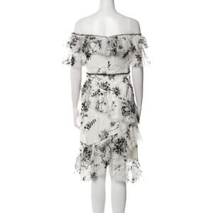 Keywords: Marchesa Notte dress, floral lace dress, off shoulder dress, tiered midi dress, black white cocktail dress, wedding guest dress, semi-formal dress, designer lace dress, special occasion dress, romantic ruffle dress.