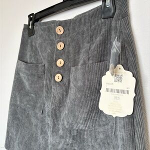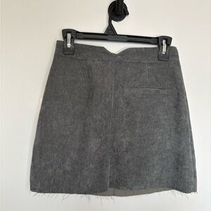 Chic charcoal corduroy mini skirt with button-front detail. Features front pockets.