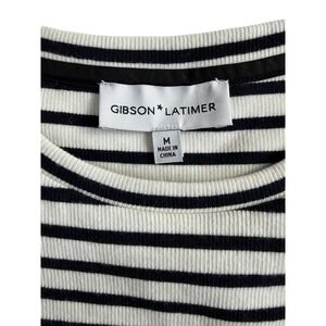 The Gibson Latimer Women's Black and White Striped Ruffle Cap Sleeve Top in size S/M is a stylish and versatile piece for any woman's wardrobe. Made by the brand Gibson & Latimer, the top features a flattering flutter sleeve and a trendy ruffle accent, giving it a chic and colorful look. Perfect for everyday wear or dressed up with accessories for a night out, this knit top in black and white stripes is a must-have addition to any closet.