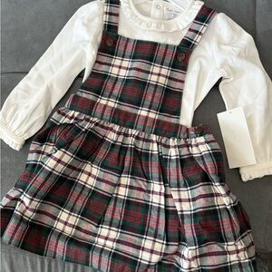 Charming plaid jumper featuring red, green, and white. Paired with a classic white long sleeve top. Ideal for special occasions.
