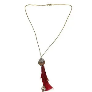 For the Handcrafted Wire Flower Heart Cork Red Suede Fringe Feather Necklace, here's a possible style description and tags: