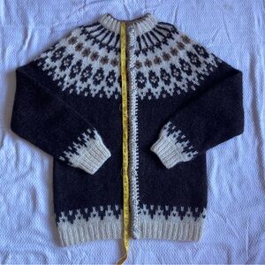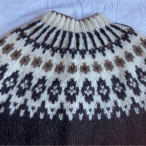 100% Wool hand knit lopapeysa in excellent condition. Missing tag, fits like L. Super warm and durable. Earth tones- cream, brown and dark chocolate. Detailed silver metal buttons.