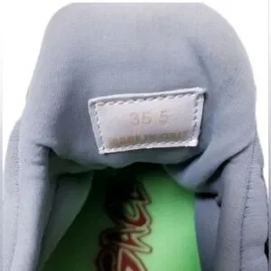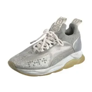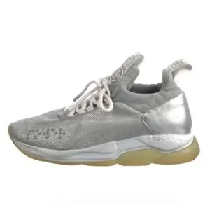 The product is a pair of Versace leather sneakers with glitter accents, featuring a stylish design perfect for dressy occasions. The EU size 35.5 and US size 5-5.5 make them suitable for women. The silver color and metal theme give them a trendy and sophisticated look, while the embroidered accents add a touch of luxury to the overall design. Made with canvas upper material, these sneakers offer both style and comfort, making them a versatile and fashionable choice for any wardrobe.