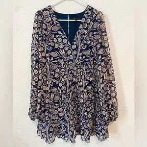 Ted Baker Tarrissa Tiered Swing Mini Blue and Tan Long Sleeves Dress Size 2