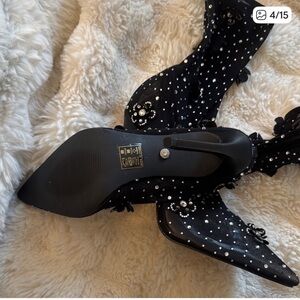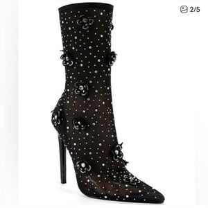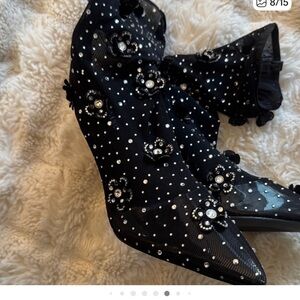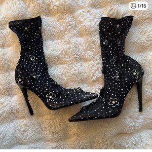 Step out in style with these chic black heeled boots, adorned with stunning embellishments. Perfect for adding a touch of glamour to any ensemble.