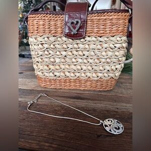 Vintage Brighton woven with brown croc leather trim handbag paired with a Brighton London Groove medallion pendant necklace.