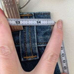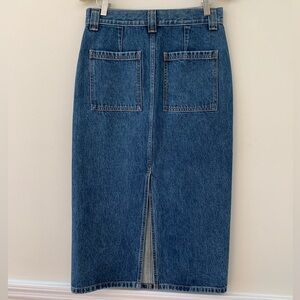 Elegant pencil skirt in classic blue denim. Features front pockets and belt loops. Perfect for versatile styling.