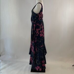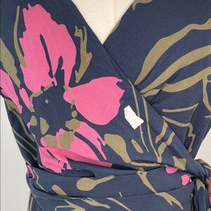 Blue floral crepe de chine (100% Polyester). Wrap. Sleeveless. V-neck. Tie closure. 58" from shoulder to hemline. Imported.