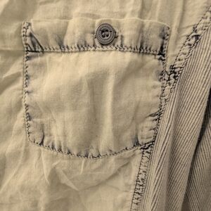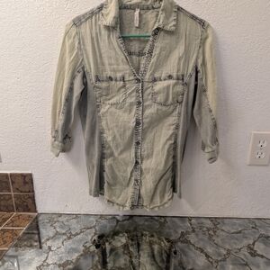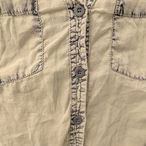 Trendy tie-dye shirt by Elan. Features cream and blue hues. Ideal for casual outings. in good condition. size small