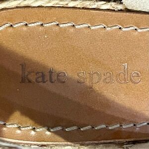Elevate your summer style with these stunning Kate Spade espadrille wedges! Featuring a soft black suede upper adorned with a ruffled grosgrain ribbon flower accent, these wedges perfectly blend sophistication and charm. The natural jute-wrapped wedge and black ribbon ankle ties give them that timeless, feminine look Kate Spade is known for.