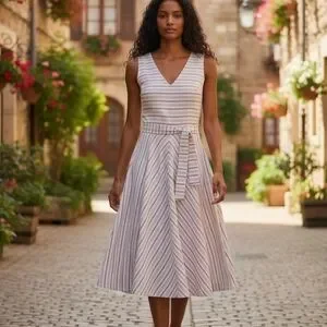 Chic midi dress with multicolor stripes. Features a V-neck and waist tie. Ideal for versatile styling.