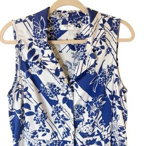 UNTUCKit sleeveless shirt dress featuring a blue and white floral print. Designed with a collared neckline, button front, and side pockets for functionality. Also has belt loops (belt not included). Excellent pre-owned condition; no flaws to note.