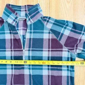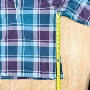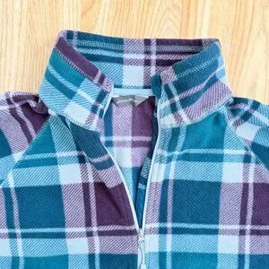 Eddie Bauer Women's Plaid Fleece 1/4 Zip Pullover Top Size Large. Good used condition, no flaws. Mock neck zip up style. Colors are a teal green and maroon plaid pattern. Soft and comfy. Size tag has been reomoved, but I'm pretty sure it is a Large. Pit to Pit is 22.5", measurements in photos.