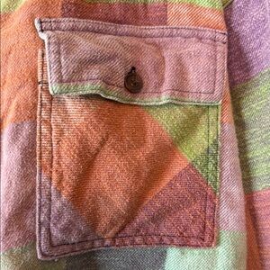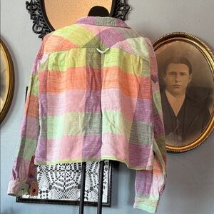 Vibrant plaid crop top. Features button-up front. Two chest pockets. Long sleeves with button cuffs. Perfect for casual wear.