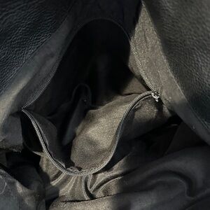 Elegant black quilted design with silver hardware. Ideal for versatile styling. USED… minor rubbing on bottom, some loose strings on straps and main pocket. Please see photos.