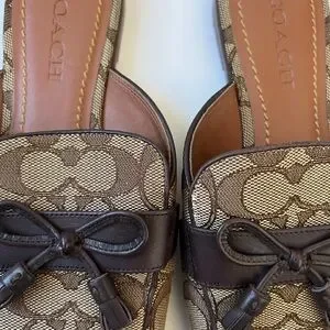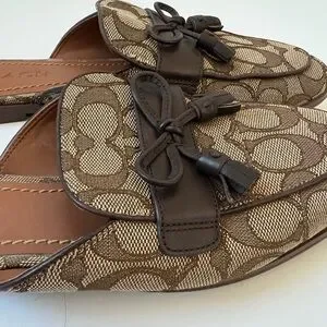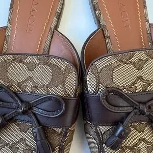 Coach women’s authentic Stassi slides size 7B great condition. Brown signature jacquard canvas, upper with mahogany, leather bow accent and tassels. Black heel. FG 4569. Chic timeless iconic classic shoes. Luxury sea print classic color for every day use