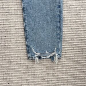 Stylish straight leg jeans with a faded blue wash. Features distressed details for a modern look. Step hem perfect detail
