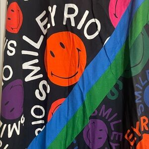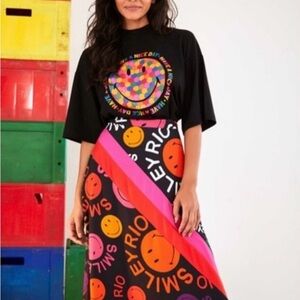 Add a fun touch with this RARE FARM Rio x Smiley skirt. Features bold smiley graphics. Black base with pink and orange accents. Perfect for a playful look.