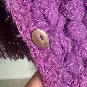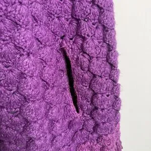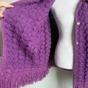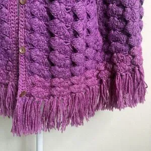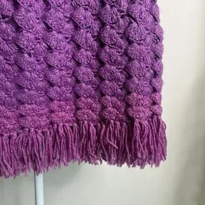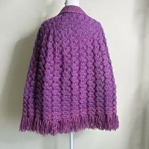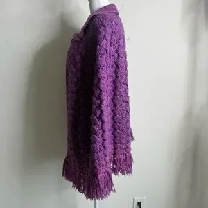 Handknit Crochet Purple Cape Poncho Wrap Sweater Chunky Fringe Granny Beige Boho