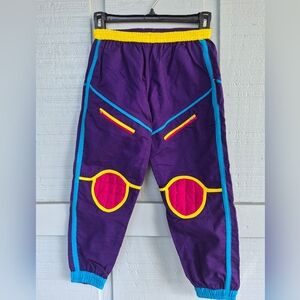 Bright purple joggers with vibrant blue and yellow trim. Features yellow waistband and colorful pockets. Matching jacket listed also
