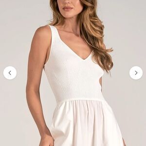 Elan “Rhodes Dress” is a mixed-media maxi dress from featuring a ribbed knit V-neck bodice and a breezy tiered skirt with pockets. Elan’s website describes it as “Rhodes Dress – the maxi tank dress with mixed media, featuring different materials for the top and bottom. With a tiered skirt and pockets, and a fitted knit V‑neck tank top”