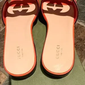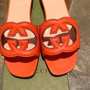 Elevate your look with these striking orange slides from Gucci. Ideal for a chic, colorful touch. Brand new in box. Never worn.