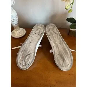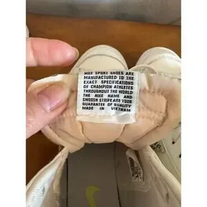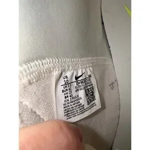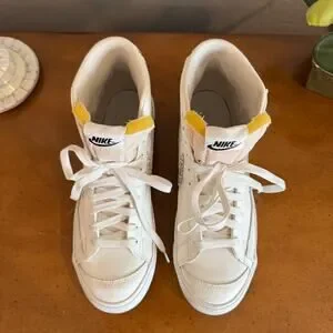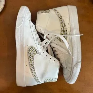 Preloved Nike Blazer Mid 77 SE Lemon Leopard in women’s size 10. White leather upper with textured rubber sole and signature leopard print Swoosh and heel tab in yellow and black. Classic high-top silhouette with lace-up closure and padded collar. Minor signs of wear consistent with light use; overall very good condition. See photos for details.