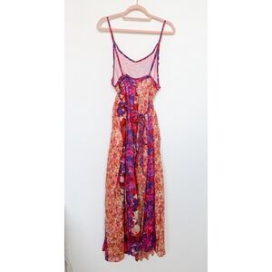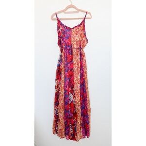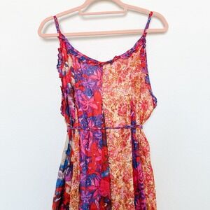 The Free People Moondive maxi dress features a vibrant patchwork floral print with contrasting panels, a billowy silhouette, and low sides for effortless boho vibes. Adjustable spaghetti straps and a self-tie waist let you customize the fit. Perfect for festivals, vacations, or layered for transitional seasons. New with tag.