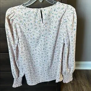 Charming pink blouse with floral pattern. Features long sleeves and gathered cuffs. Ideal for casual or dressy occasions.