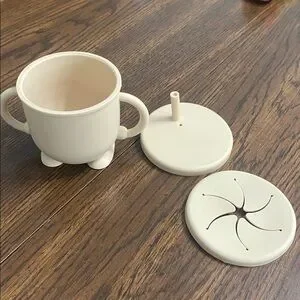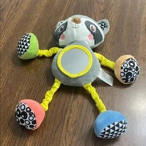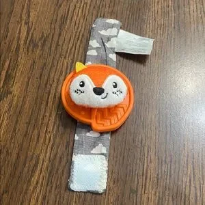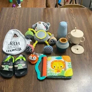 Everything is in great condition, never used! Silicone nesting bear and stacking cups, silicone cup with straw that also has a lid for snacks, one snap bib, a pair of size 7 toddler Yoda flip flops, one soft fabric book, one Fox wrist rattle, and a soft plush animal that rattles with mirror!
