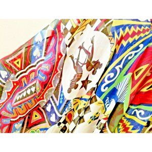 Designed by Greek fashion designer and stylist Apostolos Mitropoulos, this rare and stunning item features a fun and brightly colored graphic print that includes pistol-packing high heeled lady rats, spades, flowers, and black and white checkerboard patterns. It is made from 100% Georgette.