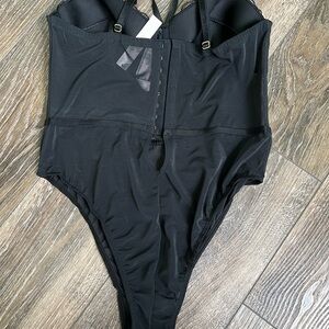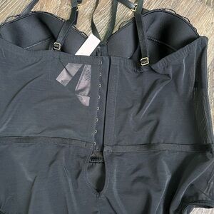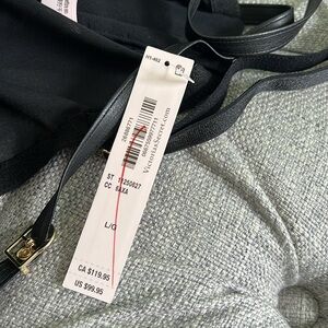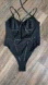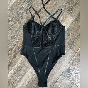 Gorgeous Victoria’s Secret black monogram, faux leather bodysuit. Features lace detailing and sheer panels. Ideal for a stylish intimate look. Size large, new with tag.