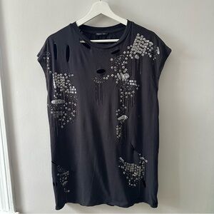 Chic and stylish black top with dazzling embellishments. Perfect for adding a touch of glamour to any outfit.