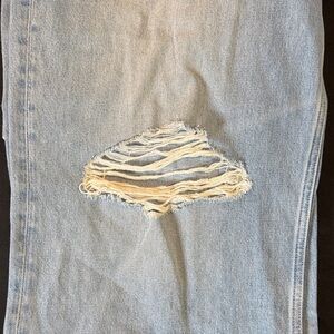 Chic light blue jeans with a relaxed fit. Features stylish distressing. Ideal for casual outings.