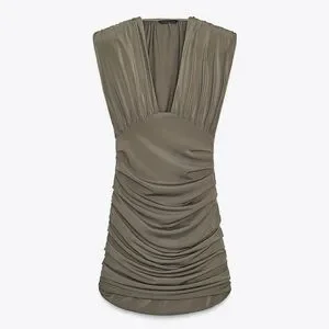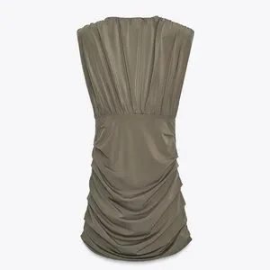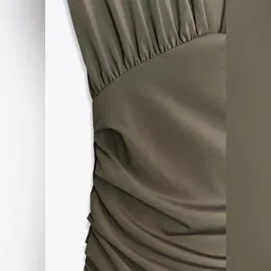 Zara NWT Khaki Olive Green Plunge Neck Ruched Shoulder Pad Mini Dress (Small)