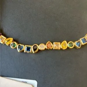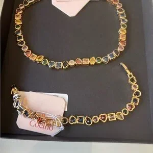 Vibrant necklace set with multicolor stones. Gold-tone finish. Perfect for adding a pop of color.