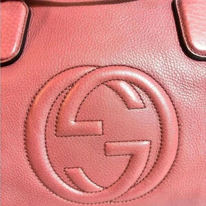 Gucci pink leather soho satchel handbag with gold tone hardware main compartment 3 pockets at interior wall 1 zip closure & zip close at top canvas lining interlocking G logo tassel accents protective feet at base single adjustable shoulder strap lining have minor stains corners have minor stains hight 9.5” wide 14” depth 4” shoulder strap 22” adjustable The dimensions are based on approximately measurements before placing an order please check take a moment to view all photos using feature for a closer look