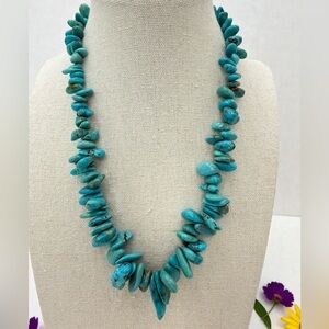 This beautiful 16” genuine graduated turquoise chip necklace features richly saturated robin’s egg to deep blue turquoise nuggets with natural brown matrix veining throughout.