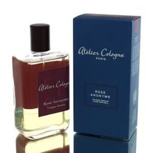 Atelier Cologne Rose Anonyme perfume with a sleek black cap and elegant blue packaging.