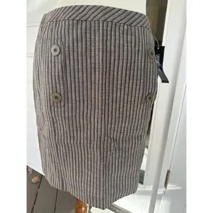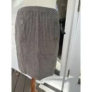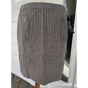 This Lafayette 148 New York skirt with a striped pattern in brown and blue. It features a zip closure and button accents, making it suitable for casual occasions. The straight and pencil style gives it a sleek look, while the brand adds a touch of sophistication to the design. Made for women's wear, this skirt offers a classic and versatile addition to any wardrobe.