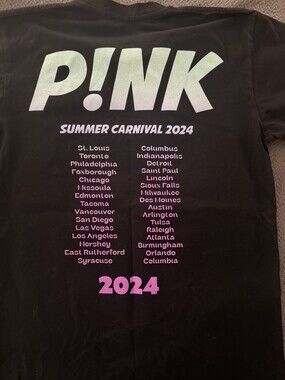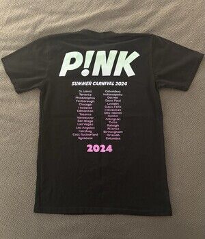 Show your love for P!nk with this official 2024 Summer Carnival tour T-shirt in Size Small — a must-have for fans of pop/rock and live music memorabilia. This shirt is perfect for concerts, casual wear, or display as part of a fan collection.