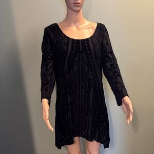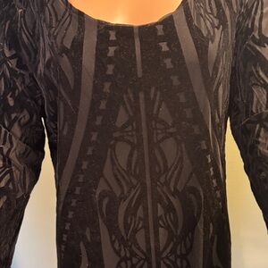 Chic black velvet shirt with intricate patterns. Long sleeves and a flattering fit. Size XL. Has been worn but shows no signs of wear, no hole or stains!