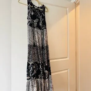 Chic maxi skirt with intricate black and white patterns. Flowy and stylish for versatile wear.