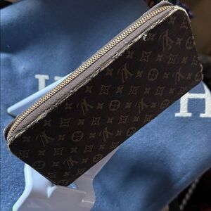 Chic Louis Vuitton Mini Lin Brown Denim wallet with classic monogram pattern. Secure zip closure.