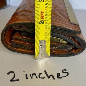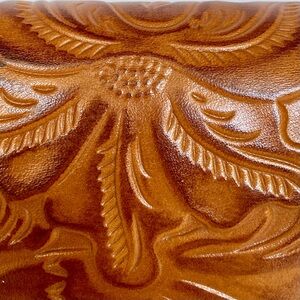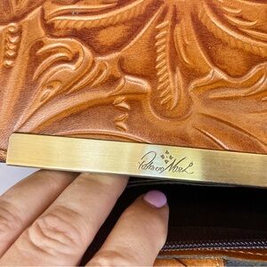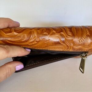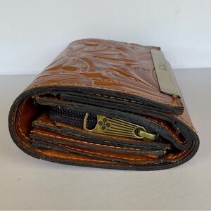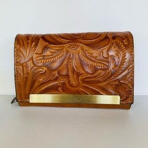 Patricia Nash Leather Cametti Trifold Wallet Organizer Tan Tooled Embossed Gold