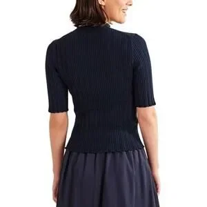 Boden Ribbed Pointelle High Neck Top Knit Short Sleeve Lettuce, Navy Blue