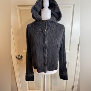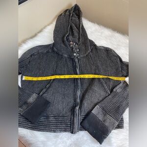 Light wear no flaws. Waffle knit. Full zip. Snap neck. Chic charcoal hooded sweater by Free People. Ideal for layering.