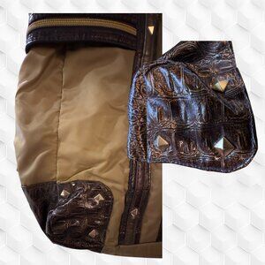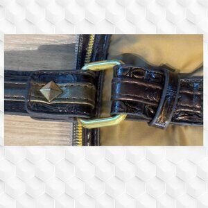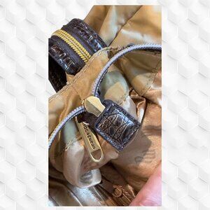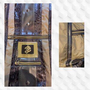 • Rich gold/beige fabric body with brown faux‑croc accents