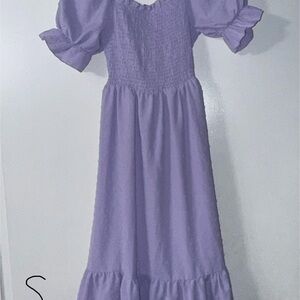Chic lavender maxi dress. Features smocked bodice and puff sleeves. Perfect for any event.