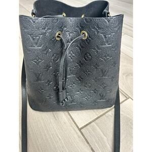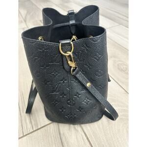 The Louis Vuitton Monogram Empreinte NéoNoé MM chip version is a luxurious shoulder bag made from black leather with a classic Louis Vuitton Empreinte finish. This stylish bag features a drawstring closure, gold hardware, and a detachable black leather strap for added versatility. With a spacious interior and elegant design, this bag is perfect for travel, parties, or casual outings, making it a staple accessory for any fashion-forward woman. Made in France, this designer piece embodies timeless sophistication and quality craftsmanship.